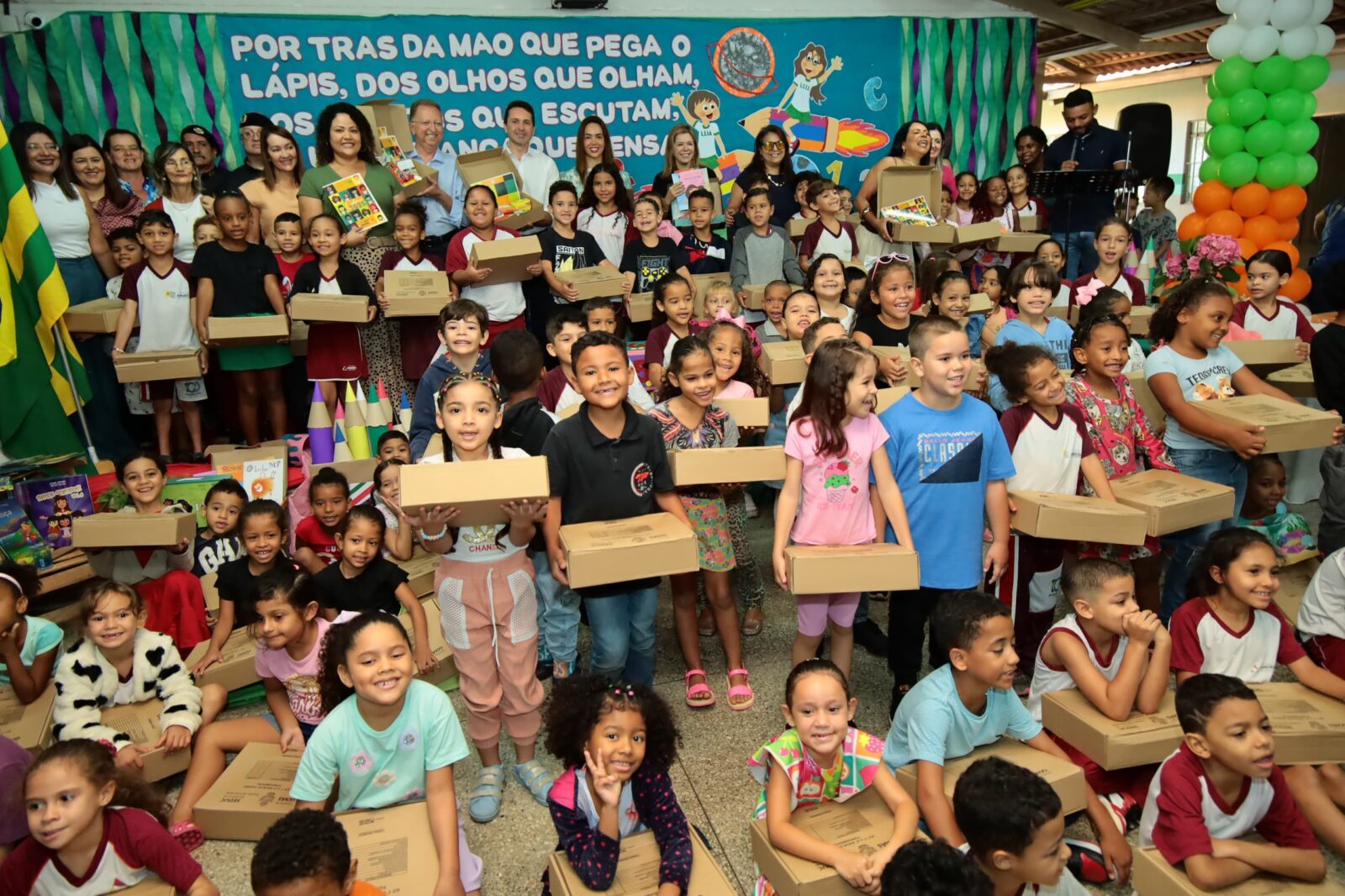 Vilela, Lana, João Campos e Professora Núbia entregaram aos alunos do 1º e 2º ano do Ensino Fundamental kits escolares enviados pelo governador Ronaldo Caiado; vice-governador, Daniel Vilela; primeira-dama, Gracinha Caiado; e pela secretária estadual de Educação, Fátima Gavioli. Receberão o kit todos os alunos da rede matriculados no Infantil G4 e Infantil G5 e 1º e 2º do Ensino Fundamental.