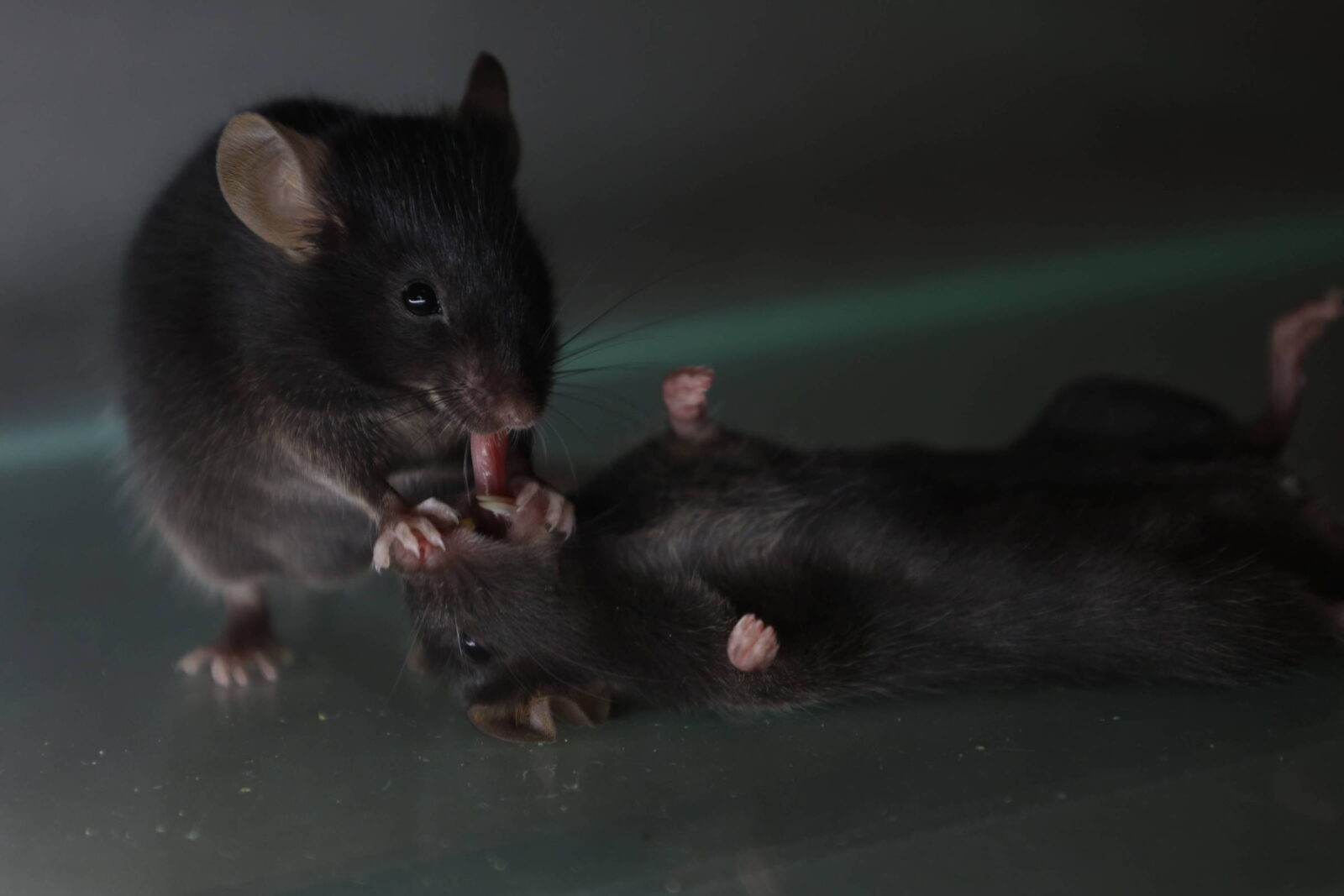 Quando o colega de gaiola cai desacordado, camundongos param de cheirar o colega (o que eles fazem habitualmente) e começam a cutucar seu corpo, e, se isso não provoca uma resposta (o que seria o caso em um colega adormecido), passam a concentrar seus esforços no rosto alheio. O contato com os olhos e boca do colega desfalecido é insistente, e logo se concentra na língua, que o camundongo acordado mordisca e até puxa para fora da boca.