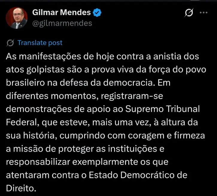 “Precisamos transformar essa energia democrática em um grande pacto nacional entre Executivo, Legislativo e Judiciário, comprometido com uma agenda de reconstrução e de futuro”, declarou Mendes em sua conta no X.