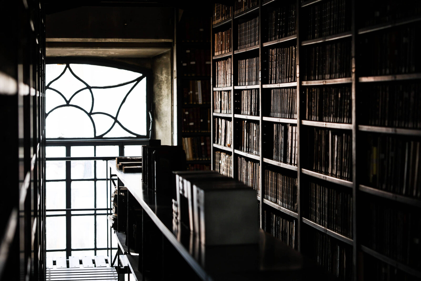 Nos corredores, com o piso feito por estruturas vazadas de ferro e madeira, é possível visualizados todos os andares. Olhando para cima e para baixo, só se enxergam livros e mais livros antigos, com suas capas duras, de cores escuras e letras douradas nas lombadas. Um passeio por ali parece cena de filme.