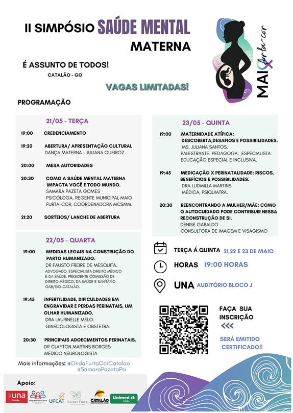 No mês em que é celebrado o Dia das Mães, os dias 21 e 23 de maio são de destaque em Catalão com a programação da campanha Maio Furta-Cor: conscientização sobre a saúde mental materna. O evento, intitulado II Simpósio Catalano pela Saúde Mental Materna tem como representante municipal da campanha a psicóloga Samara Pazeta Gomes. A Una Catalão – Ecossistema Ânima – é parceria e sediará o evento, que é aberto a toda população.