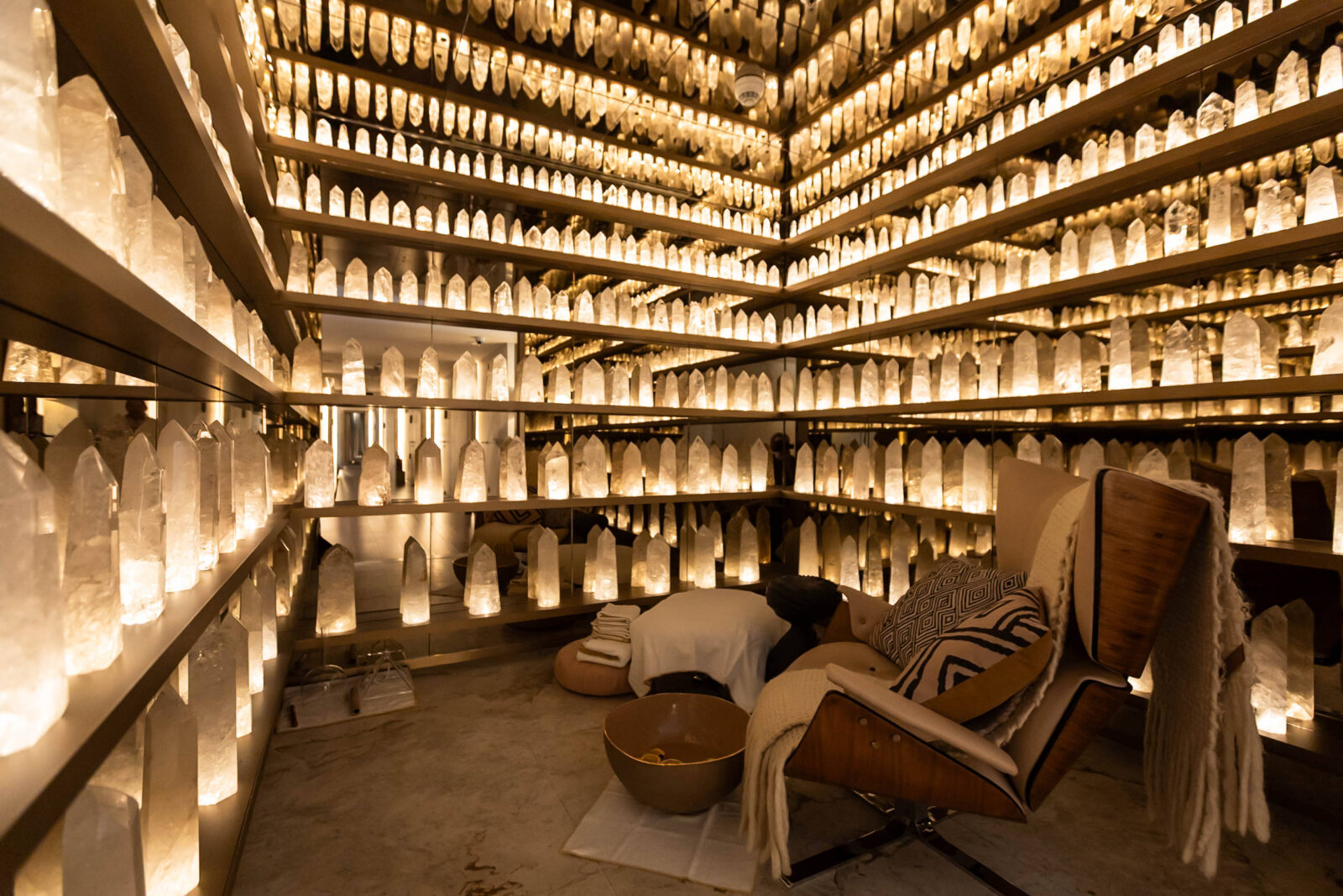 Ao sair do elevador que leva ao primeiro piso, a sensação é imediata: não se trata de mais um “puxadinho de relaxamento”, tão comum na hotelaria brasileira. A sala dos cristais impressiona. São 400 quartzos brancos que revestem o ambiente, criando reflexos que parecem abrir um portal.